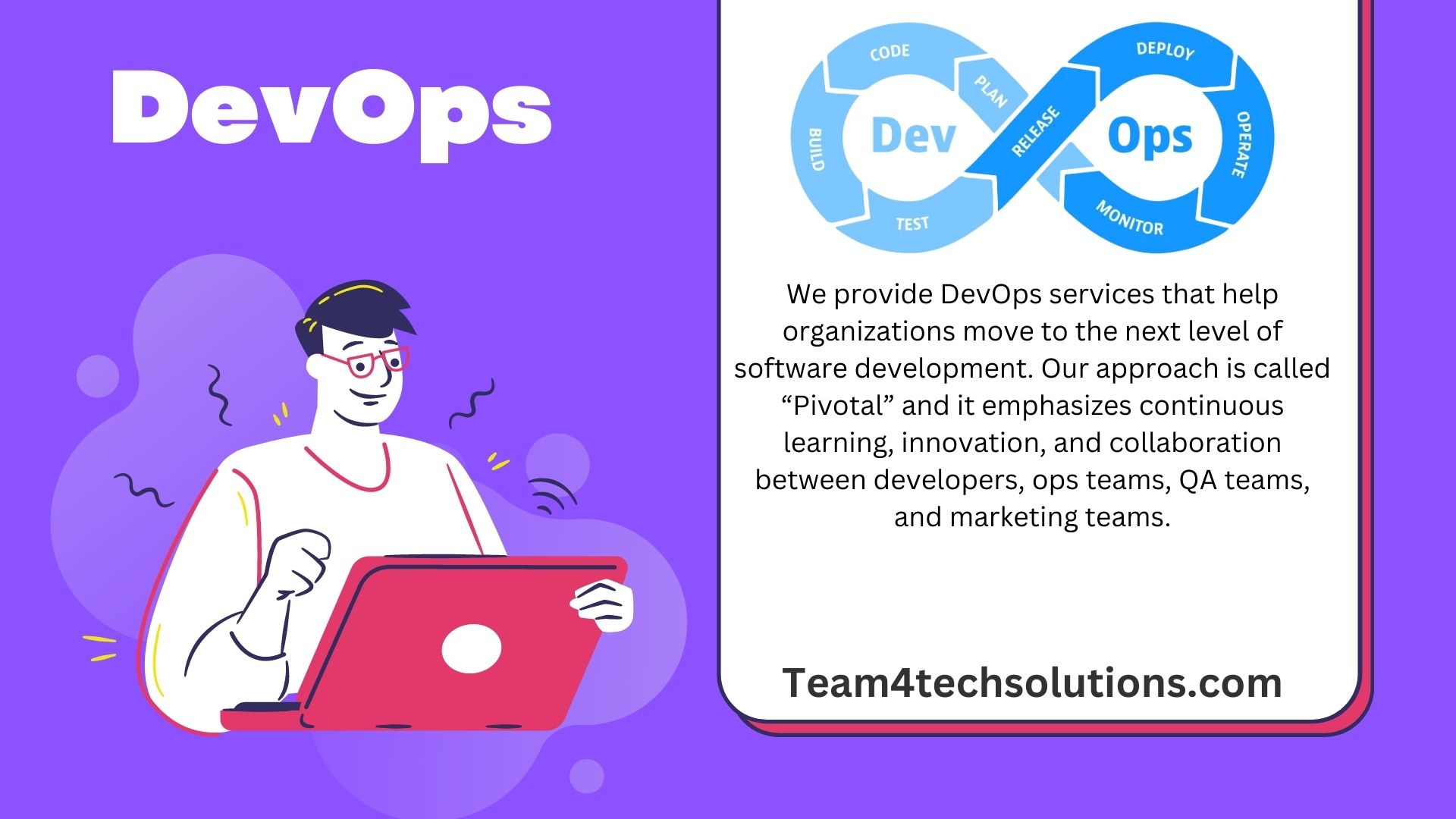 Team4techSolutions Offer a Wide Variety of IT Services by Team4techsolutions on 11/6/2022 Team4techsolutions help businesses elevate their value through custom software development, product design, QA and consultancy services.Web Development:We carry more than just good coding skills. Our experience makes us stand out from other web development.Project Management:Project Management as a Service is an adaptable consulting service that allows clients to hire as many project managers as needed to see their projects through.Mobile DevelopmentCreate complex enterprise software, ensure reliable software integration, modernise your legacy system.Digital MarketingTrust our top minds to eliminate workflow pain points, implement new tech, and consolidate app portfolios.UI/UX DesignBuild the product you need on time with an experienced team that uses a clear and effective design process.DevOpsWe help you focus on the tasks that need to be done to improve the efficiency and quality of your work, so you can focus on what you do best.