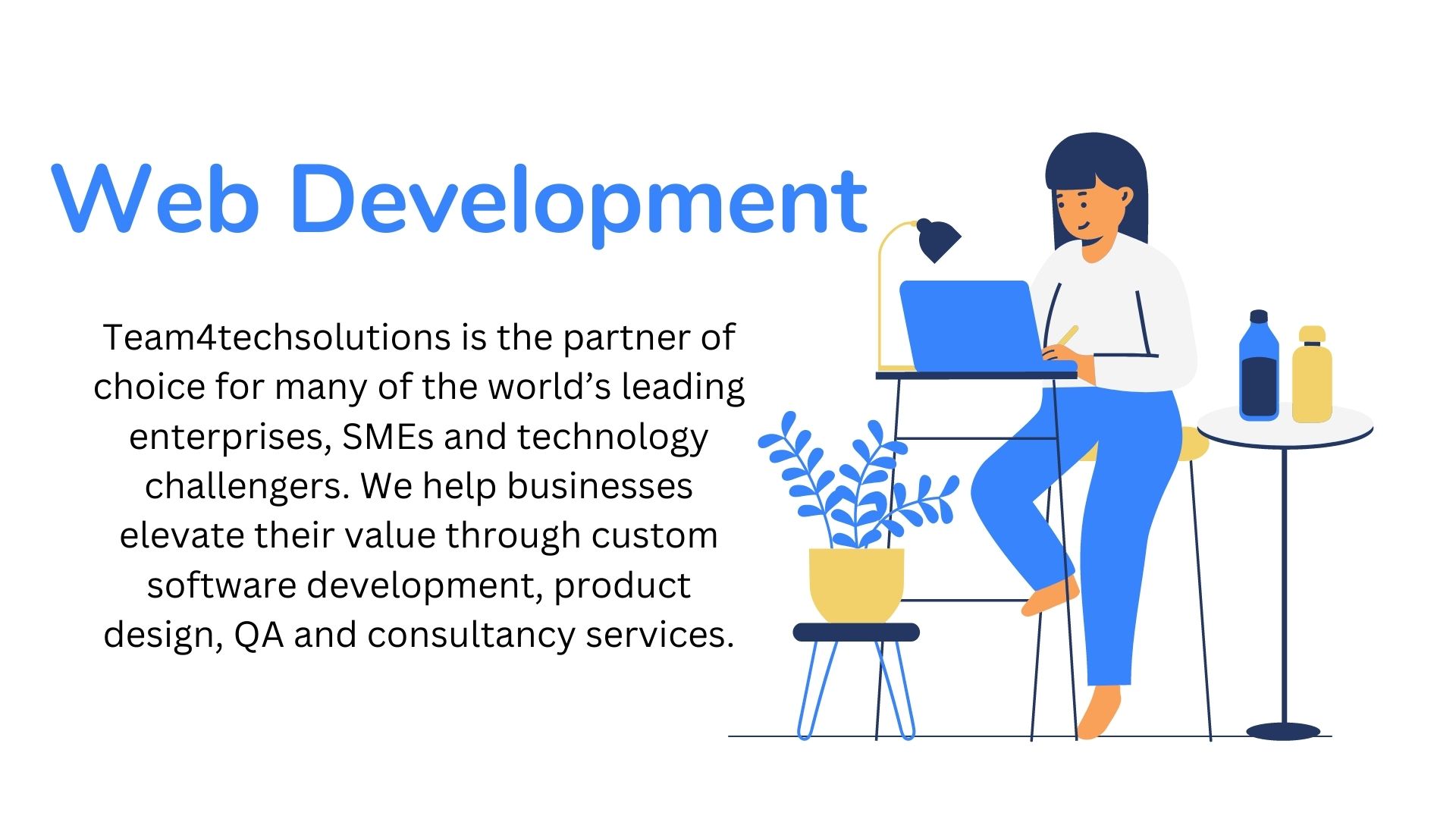 Team4techsolutions help businesses elevate their value through custom software development, product design, QA and consultancy services.Web Development:We carry more than just good coding skills. Our experience makes us stand out from other web development.Project Management:Project Management as a Service is an adaptable consulting service that allows clients to hire as many project managers as needed to see their projects through.Mobile DevelopmentCreate complex enterprise software, ensure reliable software integration, modernise your legacy system.Digital MarketingTrust our top minds to eliminate workflow pain points, implement new tech, and consolidate app portfolios.UI/UX DesignBuild the product you need on time with an experienced team that uses a clear and effective design process.DevOpsWe help you focus on the tasks that need to be done to improve the efficiency and quality of your work, so you can focus on what you do best.