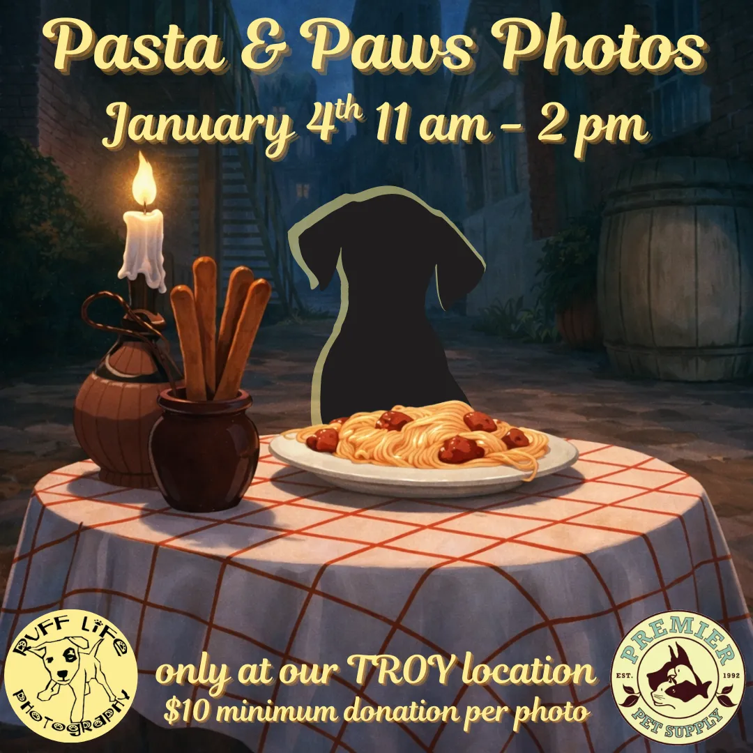 🍝 Come celebrate National Spaghetti Day with "Pasta & Paws" pet photos at Premier Pet Supply Troy! 🍝 Ruff Life Photography will be at our Troy location on Sunday, January 4th, from 11:00 a.m. to 2:00 p.m. for Pasta & Paws-themed pet photos! Each photo is a $10 donation to a local rescue, plus you'll go home with a printout of your pet's adorable photo! *Please note that our photo events can get extremely busy and ensure that you have enough adults to handle any kids or pets with you*