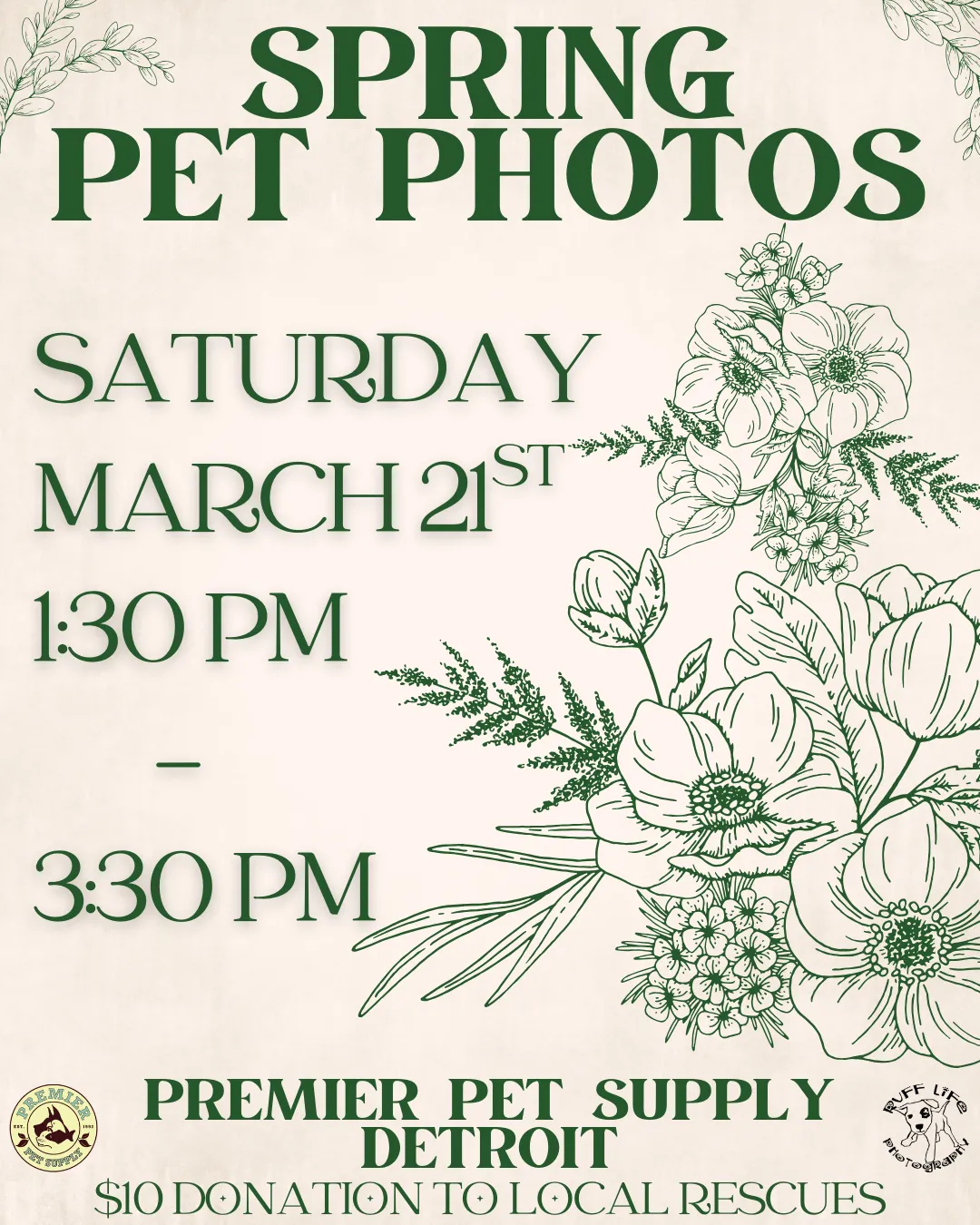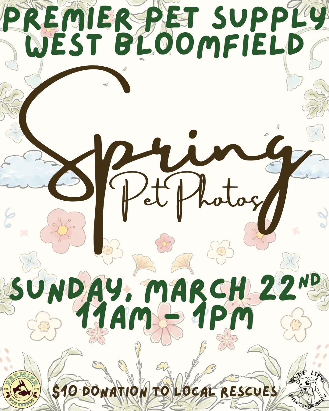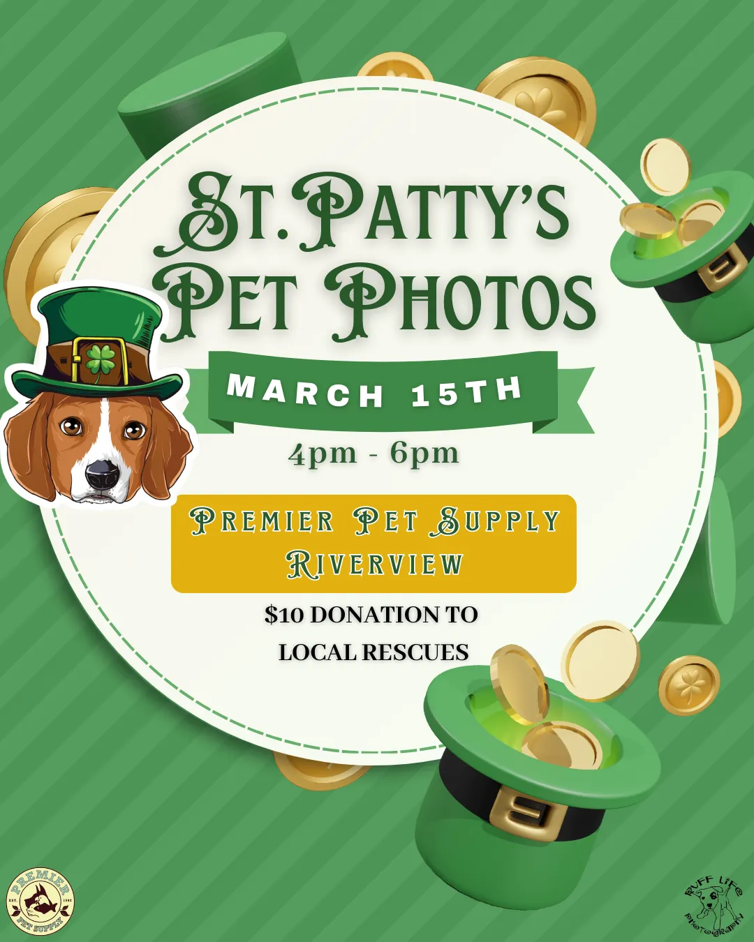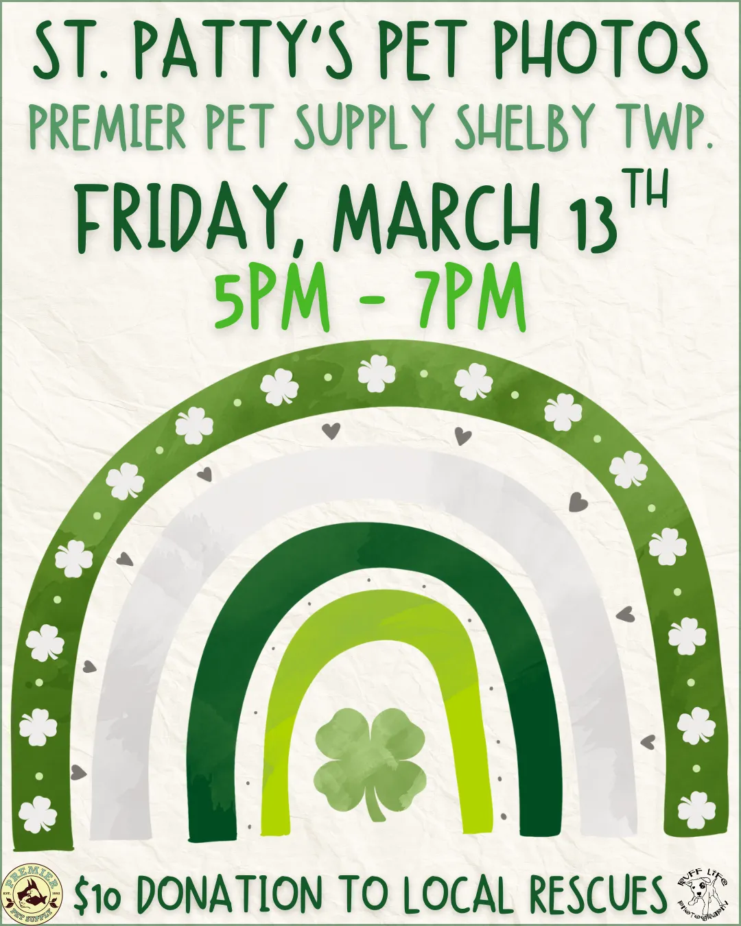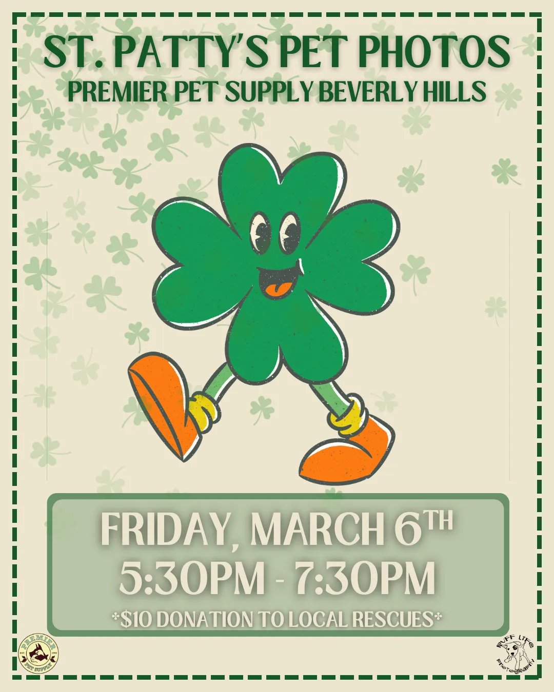 🍀Puppy kisses and four-leaf clover wishes🍀 Join us for St.Patty's themed pet photos with Ruff Life Photography at Premier Pet Supply Beverly Hills! Photos are Friday, March 6th, from 5:30 pm - 7:30 pm! All photos are a $10 donation to a local rescue, and you go home with a printout of your pet's adorable photo! *Please note that our photo events can get extremely busy. Please ensure to have enough adults to handle all kids or pets with you*