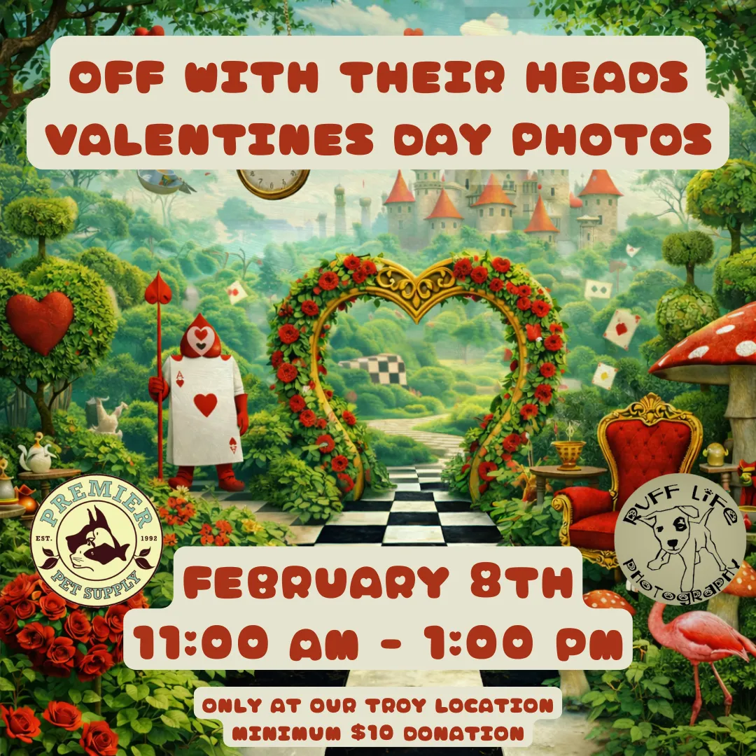 💗 Join us for a special "Off With Their Heads!" Valentines-Themed Pet Photos with Ruff Life Photography at Premier Pet Supply Troy! Photos will be on Sunday, February 8th, from 11am - 1pm! Each photo is a $10 donation to a local rescue, plus you go home with a printout of your pet's adorable photo! 💗 *Please note that our photo events can get very busy. Please ensure you have enough adults to handle any kids or pets with you*
