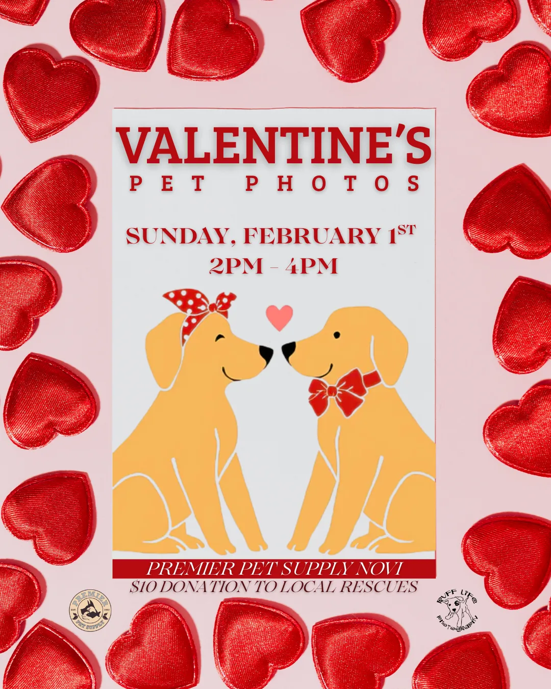 💗 Join us for Valentines-Themed Pet Photos with Ruff Life Photography at Premier Pet Supply Novi! Photos will be on Sunday, February 1st, from 2pm - 4pm! Each photo is a $10 donation to a local rescue, plus you go home with a printout of your pet's adorable photo! 💗 *Please note that our photo events can get very busy. Please ensure you have enough adults to handle any kids or pets with you*