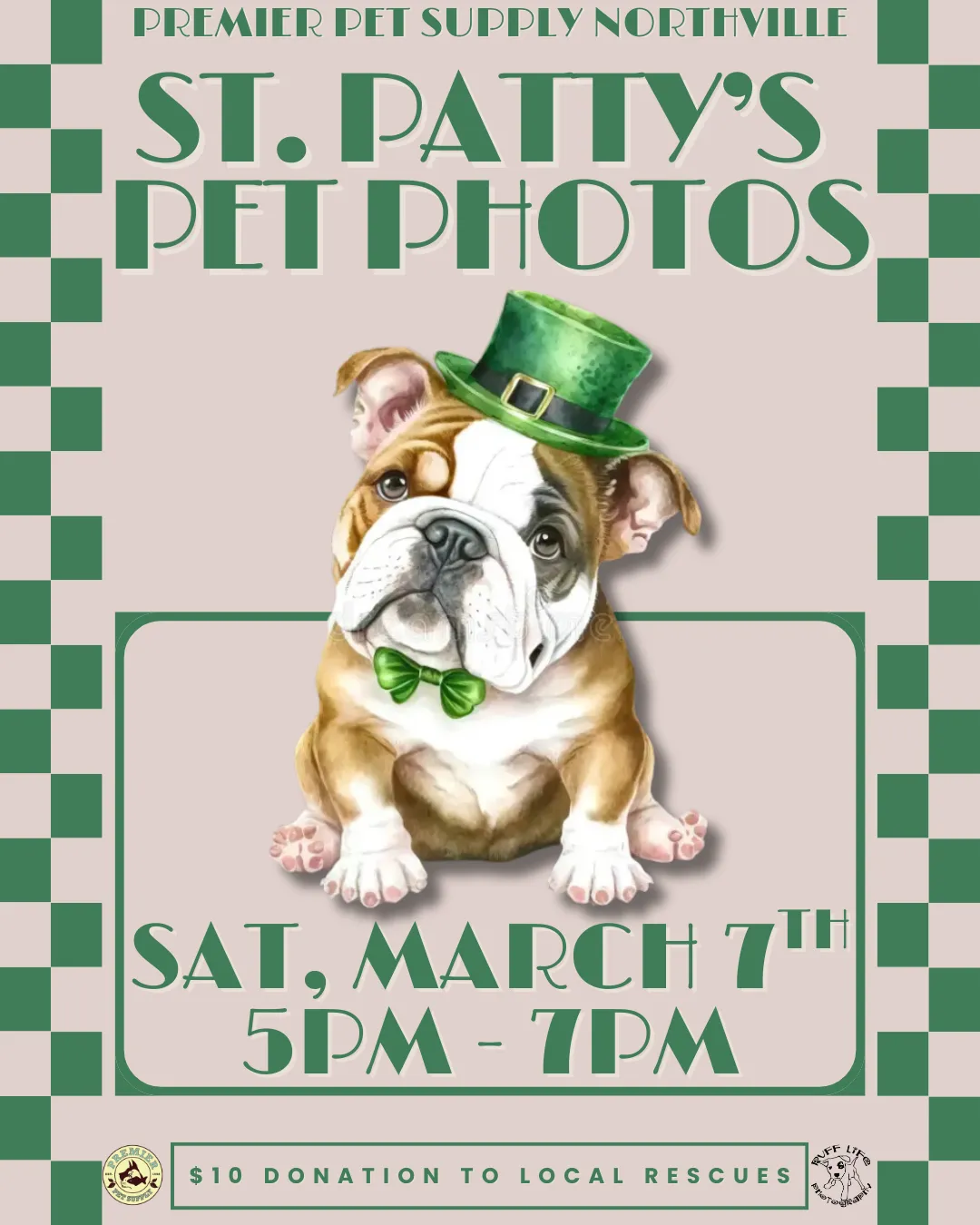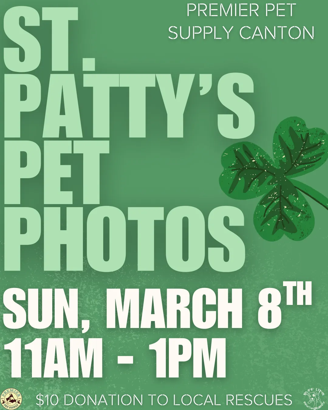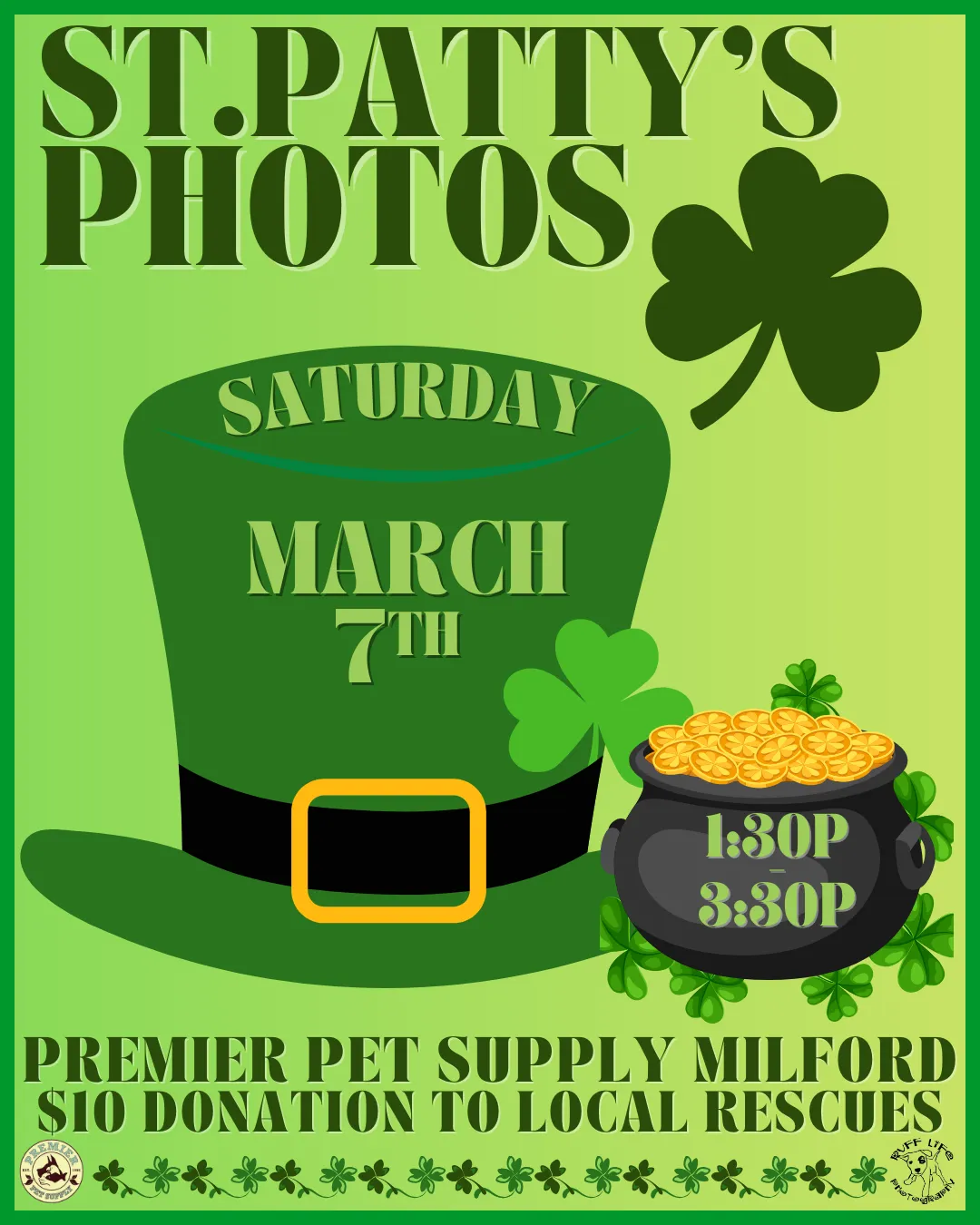 🍀Puppy kisses and four-leaf clover wishes🍀 Join us for St.Patty's themed pet photos with Ruff Life Photography at Premier Pet Supply Milford! Photos are Saturday, March 7th, from 1:30 pm - 3:30 pm! All photos are a $10 donation to a local rescue, and you go home with a printout of your pet's adorable photo! *Please note that our photo events can get extremely busy. Please ensure to have enough adults to handle all kids or pets with you*