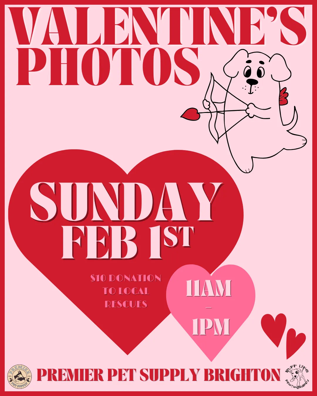 💗 Join us for Valentines-Themed Pet Photos with Ruff Life Photography at Premier Pet Supply Brighton! Photos will be on Sunday, February 1st, from 11am - 1pm! Each photo is a $10 donation to a local rescue, plus you go home with a printout of your pet's adorable photo! 💗 *Please note that our photo events can get very busy. Please ensure you have enough adults to handle any kids or pets with you*