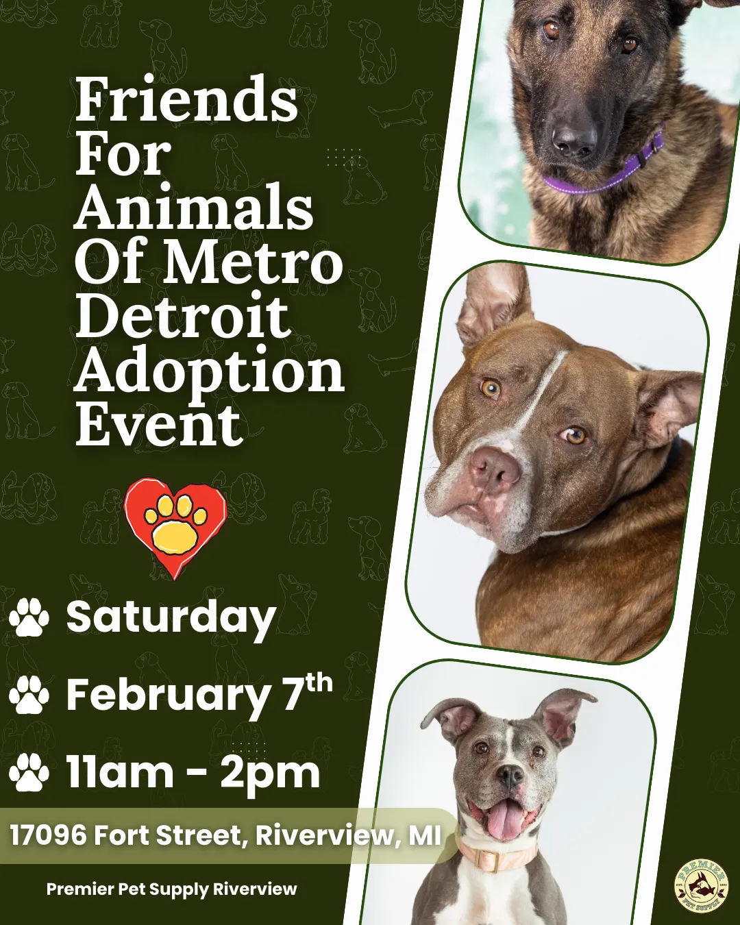 🐶 Come meet and take home your best friend! 🐶 Friends For Animals Of Metro Detroit (Dearborn Animal Shelter) will be hosting an adoption event at Premier Pet Supply Riverview on Saturday, February 7th, from 11am - 2pm!