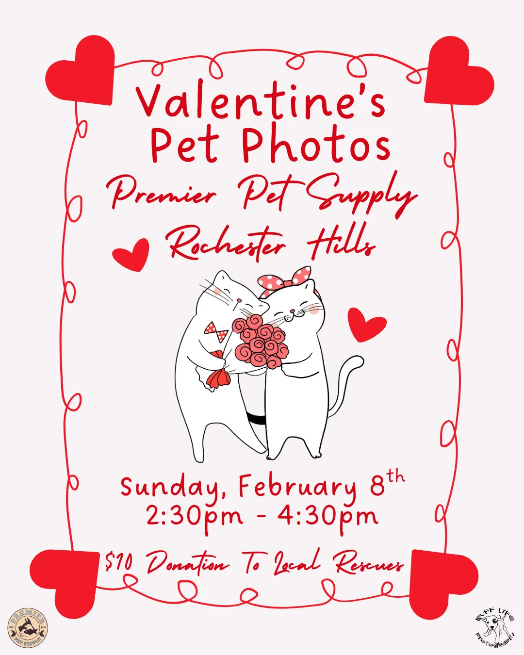 💗 Join us for Valentines-Themed Pet Photos with Ruff Life Photography at Premier Pet Supply Rochester Hills! Photos will be on Sunday, February 8th, from 2:30pm - 4:30pm! Each photo is a $10 donation to a local rescue, plus you go home with a printout of your pet's adorable photo! 💗 *Please note that our photo events can get very busy. Please ensure you have enough adults to handle any kids or pets with you*